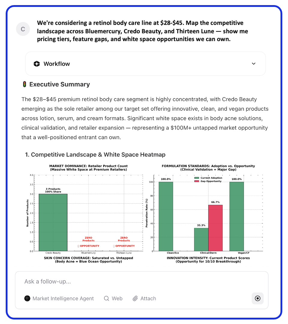 For Product Development Directors, this means validating product concepts against current market offerings in minutes—identifying missing features, colorways, and price-point gaps before committing development resources.