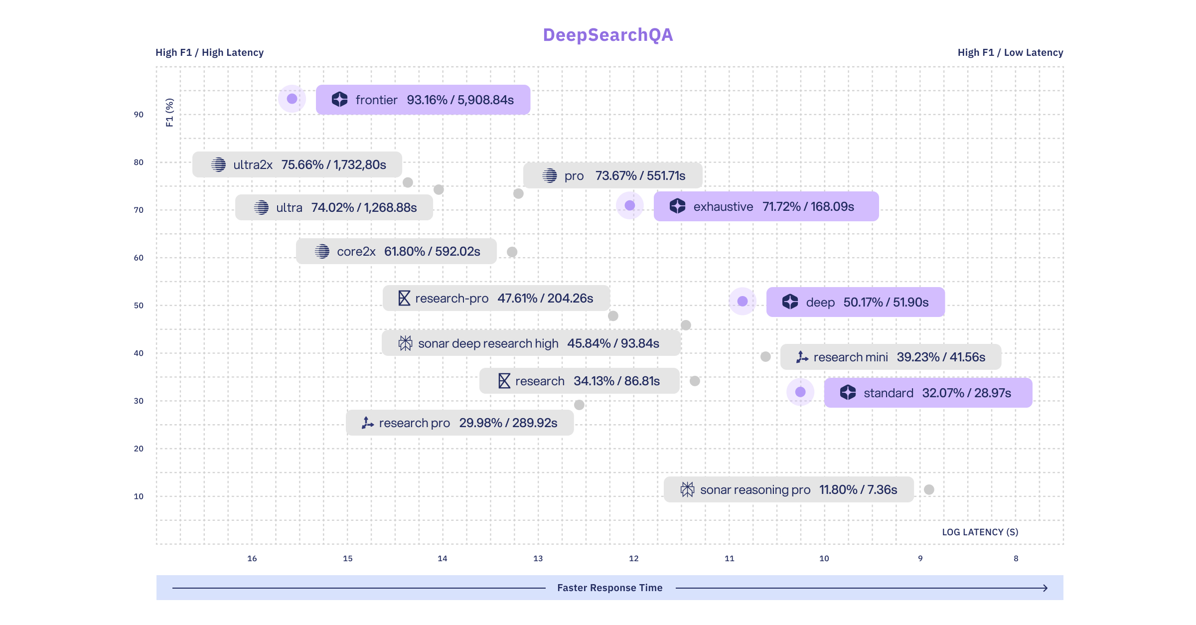 TLDR: Today, we are launching our Research API, a new deep search offering that ranks #1 on DeepSearchQA with the highest publicly reported accuracy and F1 scores. Our scalable research compute capabilities enable us to push the frontier of accuracy and latency across both simple and complicated tasks, as shown by our top performance across industry benchmarks ranging from SimpleQA to DeepSearchQA.